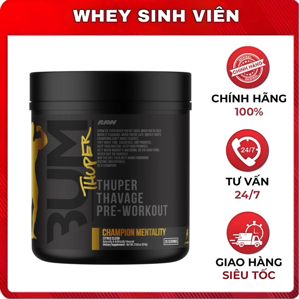 Khi nhắc đến các dòng pre-workout đỉnh cao, không thể không nhắc tới CBUM Thuper Thavage Pre-Workout – sản phẩm được phát triển bởi Chris Bumstead, vận động viên 6 lần vô địch Classic Mr. Olympia. Với công thức mạnh mẽ và bảng thành phần “khủng”, Thuper Thavage mang đến năng lượng, sức bền và sự tập trung vượt trội, giúp người tập đạt đến giới hạn cao nhất trong mỗi buổi tập.