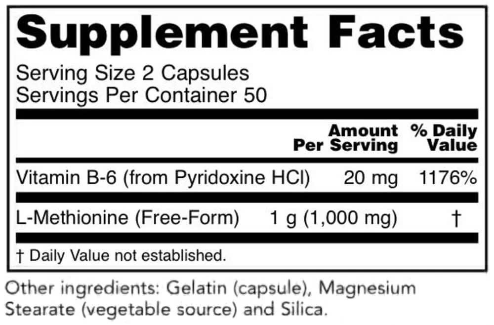 L-Methionine (500mg): Là một amino axit thiết yếu mà cơ thể cần để duy trì chức năng tế bào và quá trình chuyển hóa. Methionine giúp sản xuất các hợp chất quan trọng như cysteine và glutathione, có vai trò quan trọng trong việc bảo vệ cơ thể khỏi các tác nhân gây hại từ môi trường.