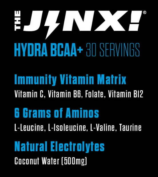 - Có rất nhiều BCAA trên thị trường, nhưng không có loại nào thành công như The Jinx! Với 6g axit amin (L-Leucine, L-Isoleucine, L-Valine, Taurine), chất điện giải tự nhiên và Ma trận Vitamin Miễn dịch (Vitamin C, Vitamin B6, Folate, Vitamin B12), The Jinx! tạo ra một cú shock khi nói đến khả năng phục hồi cơ bắp nhanh hơn và đạt kết quả tốt hơn.
